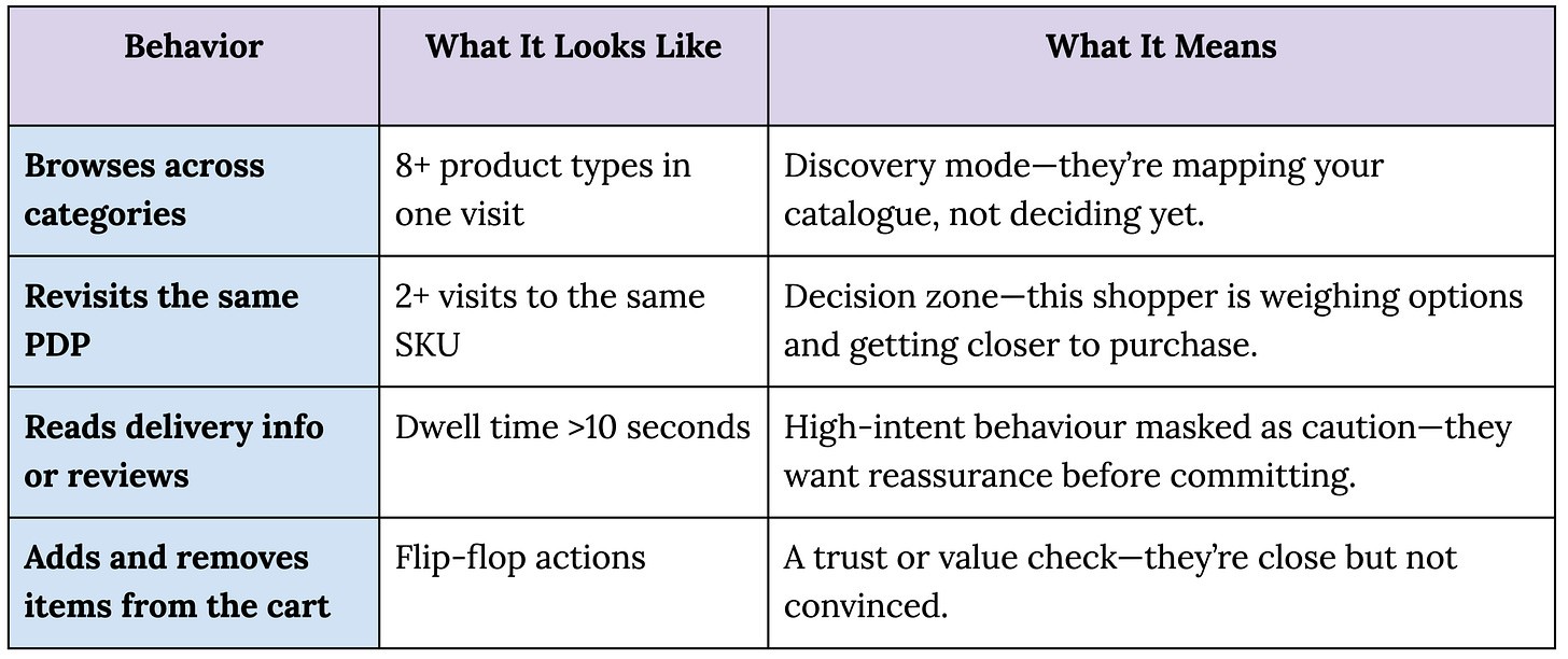 The key is to focus on pattern, not volume. Ten random clicks tell you nothing. One deliberate revisit does. A quick PDP bounce means disinterest; a repeat visit to the same SKU within minutes means you’re seconds away from a sale.